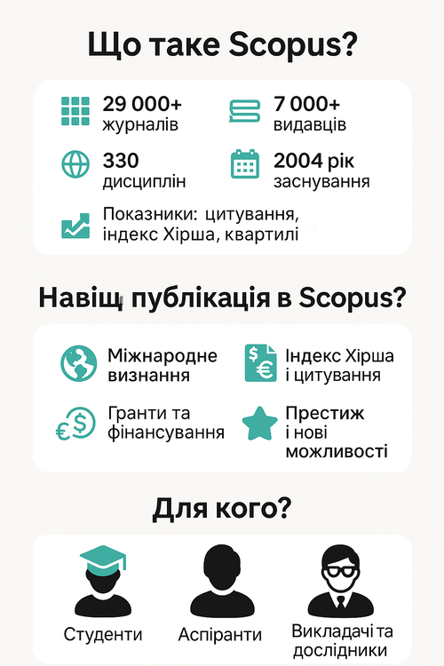 Викладачі та дослідники також не можуть обійтися без публікацій у Scopus, адже це важливий показник їхньої професійної компетентності, що впливає на присвоєння вчених звань, отримання грантів і просування в університетських рейтингах. Отже, публікації в Scopus — це справжня валюта сучасної науки, яка відкриває двері до міжнародної співпраці, нових ресурсів і можливостей для професійного зростання.