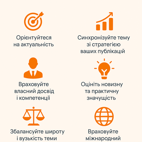 Вибір теми — це основа вашої майбутньої наукової публікації. Успіх статті багато в чому залежить від того, наскільки правильно ви її визначите.